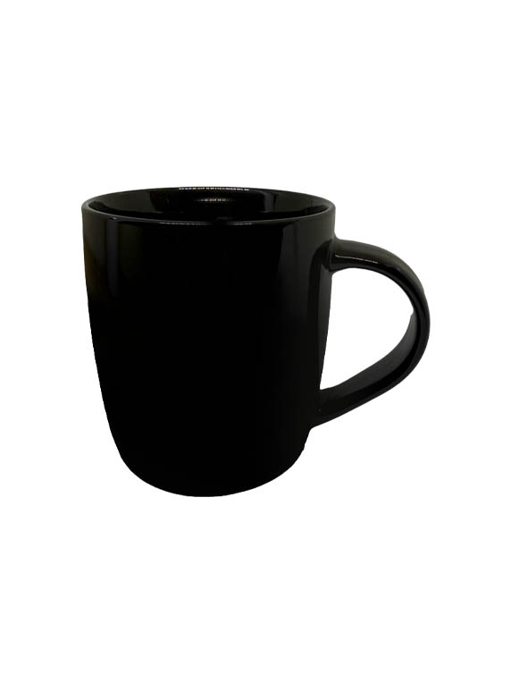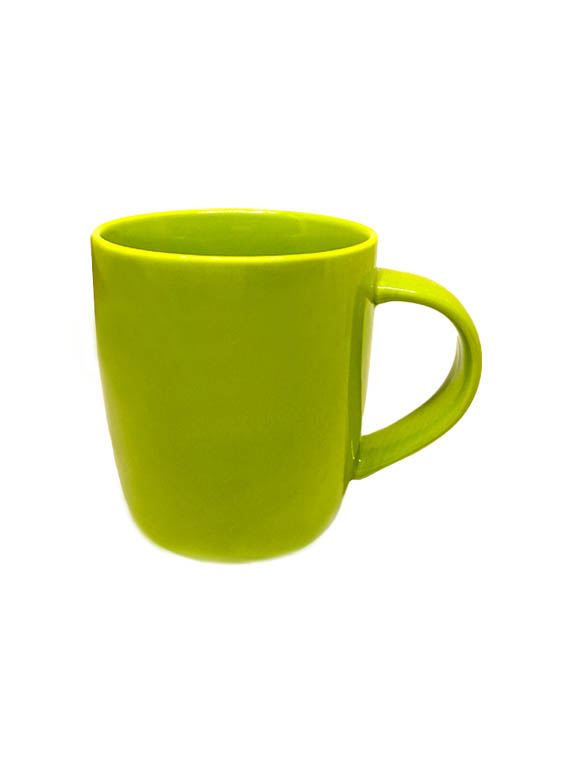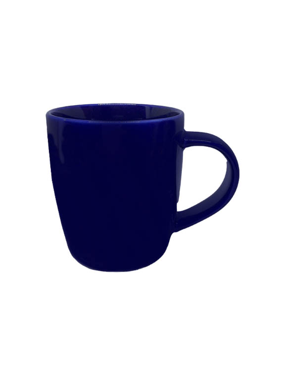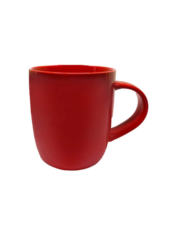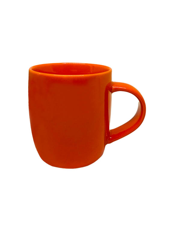 Taza de cerámica disponible en colores surtidos: roja, naranja, amarillo, azul marino, verde, y negra. Logotipo impreso a una tinta.